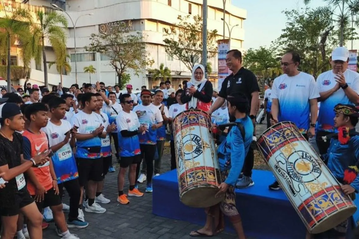 Gubernur Nusa Tenggara Barat, H Lalu Muhamad Iqbal (kiri), dan Kepala Perwakilan Bank Indonesia Provinsi NTB, Hario Kartiko Pamungkas (tengah), melepas peserta Fun Run 5K Pekan QRIS Nasional di area parkir Lombok Epicentrum Mall, Kota Mataram, Sabtu (16/8/2025). ANTARA/Wal