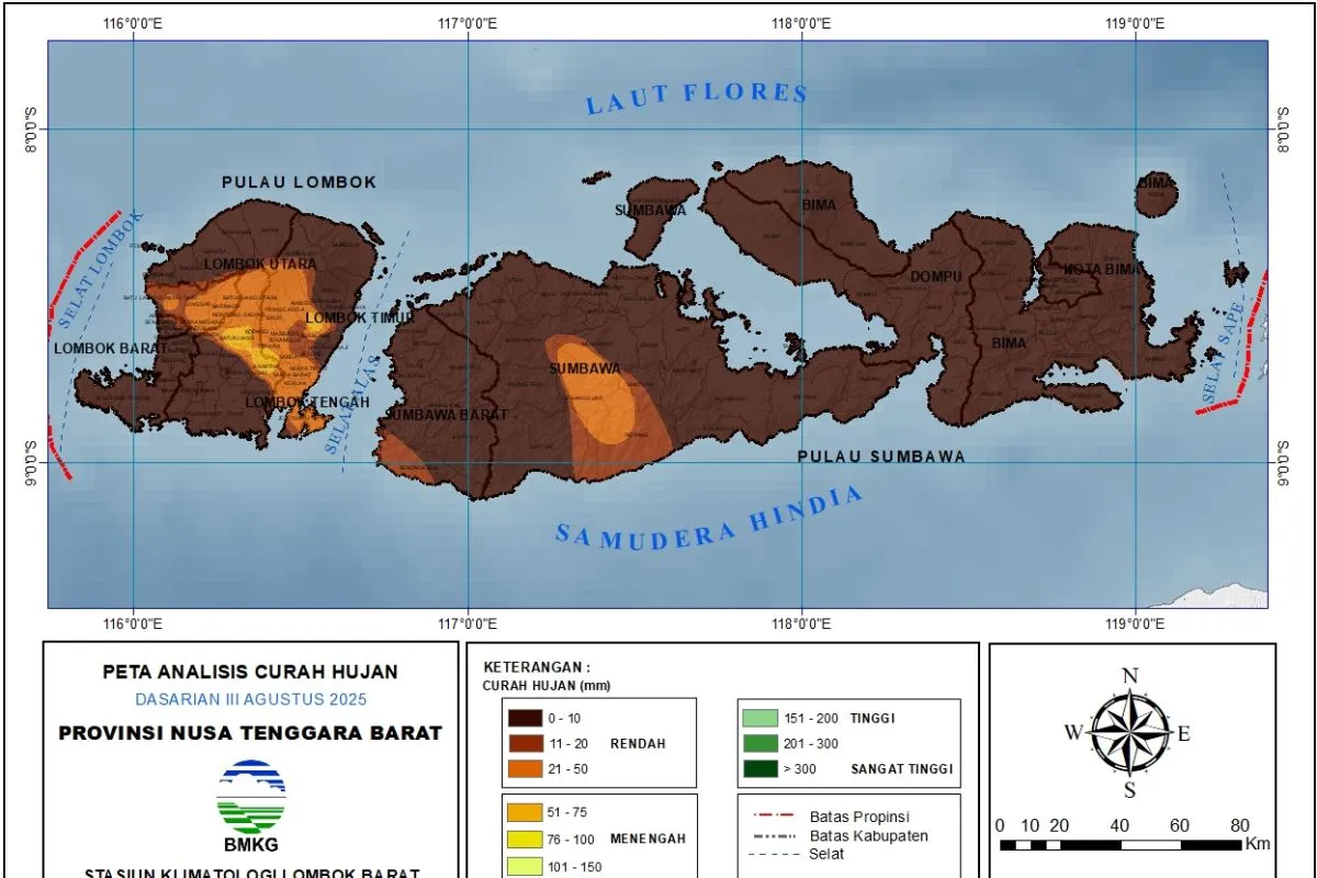 Afriyas menuturkan hasil pemantauan curah hujan pada dasarian terakhir Agustus 2025 menunjukkan sebagian besar wilayah Nusa Tenggara Barat masuk kategori rendah 0 hingga 50 milimeter.