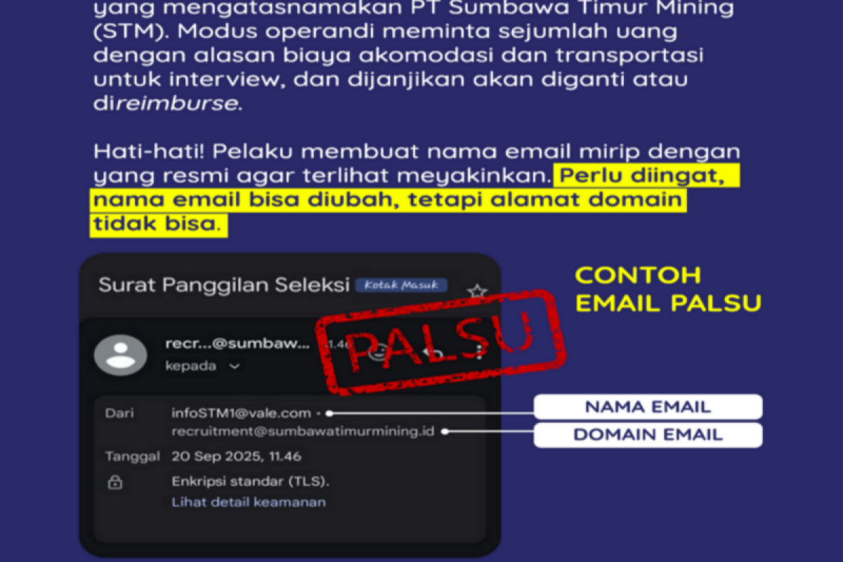 Dompu (ANTARA) - PT Sumbawa Timur Mining (STM), mengimbau masyarakat untuk mewaspadai maraknya modus penipuan lowongan pekerjaan yang mengatasnamakan perusahaan tersebut.