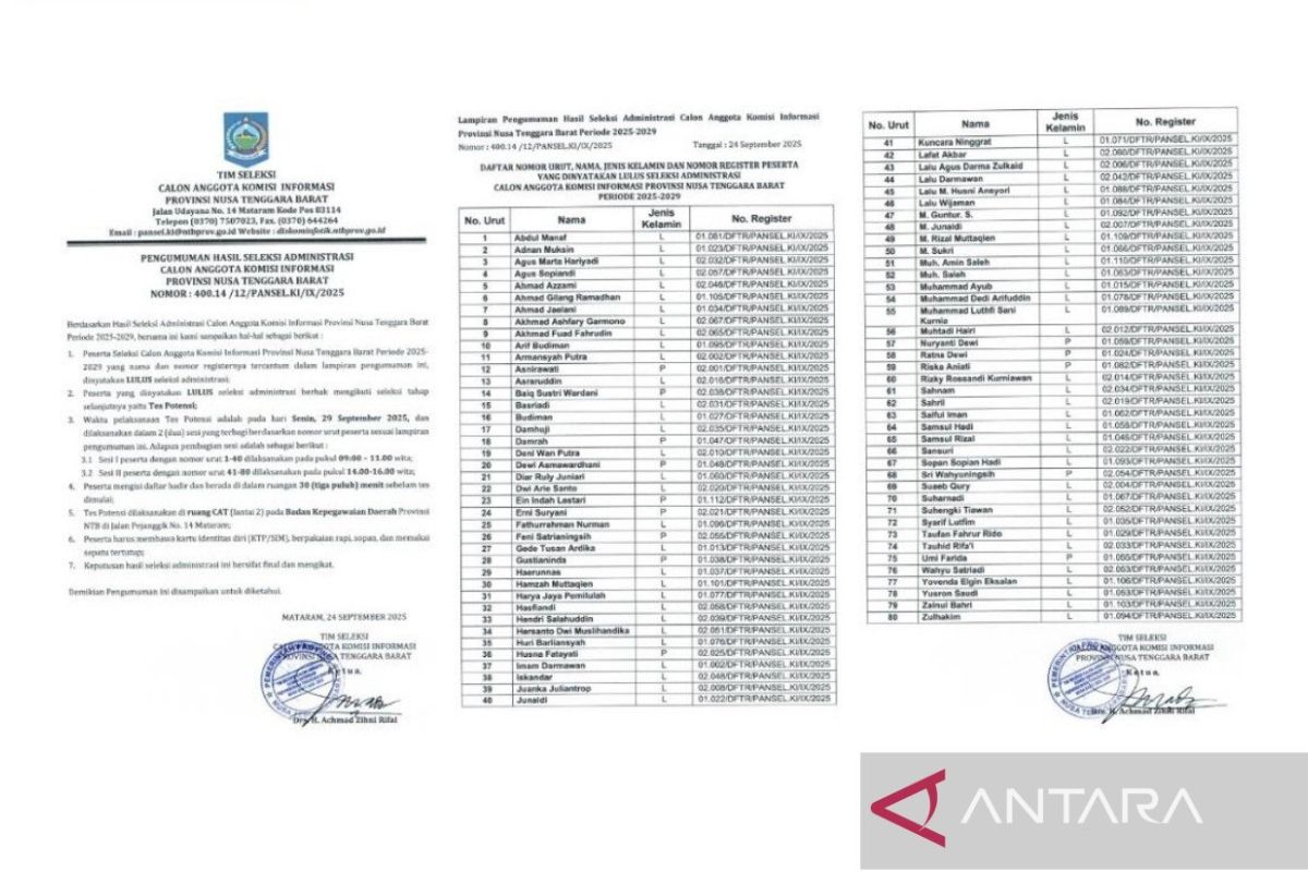 Mataram (ANTARA) - Sebanyak 80 orang peserta dinyatakan lulus administrasi calon anggota Komisi Informasi (KI) Provinsi Nusa Tenggara Barat (NTB) periode 2025-2029.