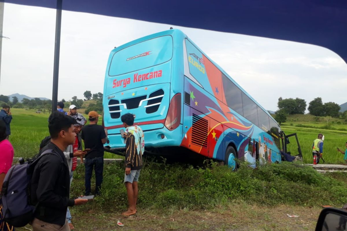 Akibat kecelakaan tersebut, bus yang mengangkut puluhan penumpang menuju Bima itu terpental dan terjun ke sawah. Untungnya para penumpang selamat dalam kejadian tersebut.