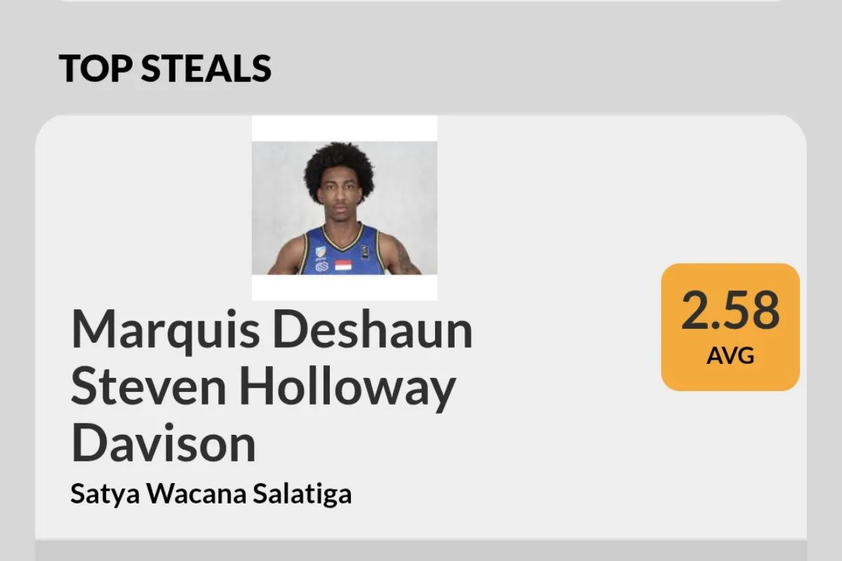 Jakarta (ANTARA) - Pebasket asing Satya Wacana Salatiga, Marquis Deshaun Steven Holloway Davison, menjadi raja mencuri bola (steal) Indonesian Basketball League (IBL) 2025, hingga awal pekan ke-18.
