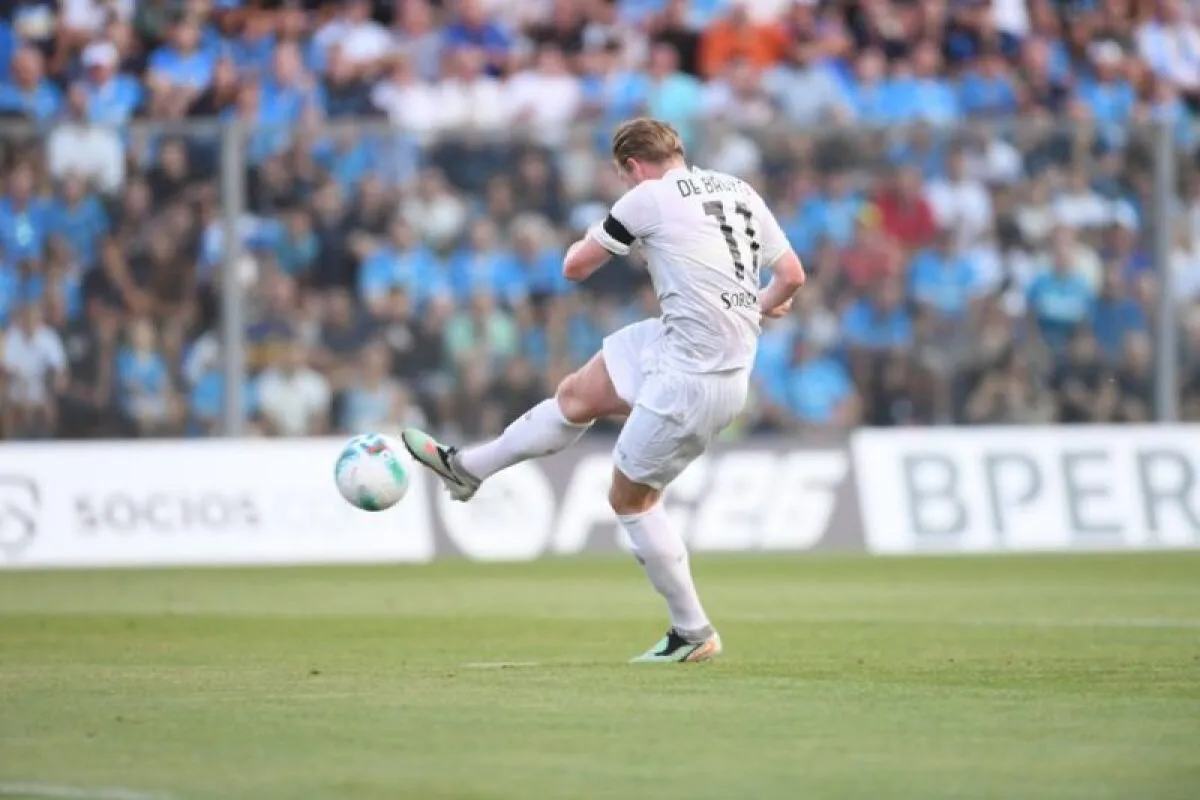 Kevin de Bruyne membawa bola dari tengah hingga ke depan kotak penalti sebelum memberikan ke Scott McTominay, yang kemudian menyodorkan bola ke Lorenzo Lucca.