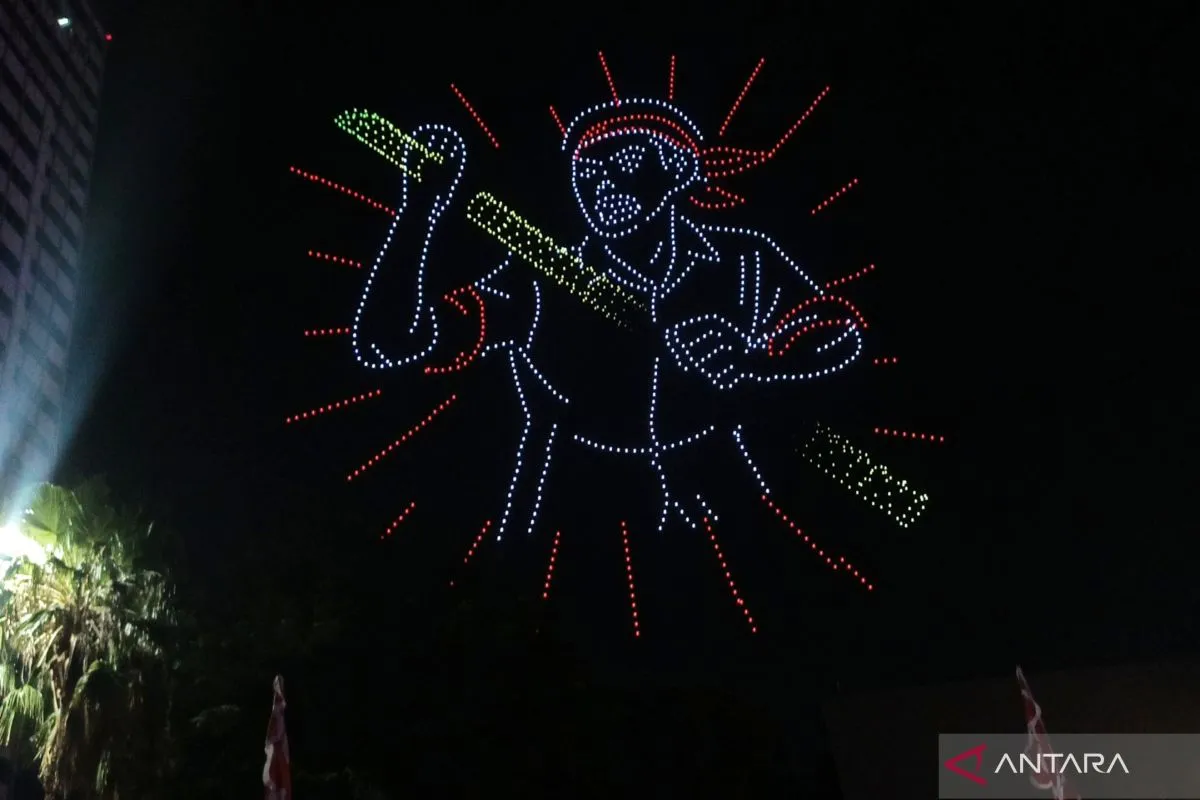 Jakarta (ANTARA) - Pertunjukan drone yang menampilkan ilustrasi program pemerintah dan ragam pesan kebangsaan, serta kembang api menutup Karnaval Hari Ulang Tahun (HUT) RI ke-80 di Bundaran HI, Jakarta, Minggu malam.