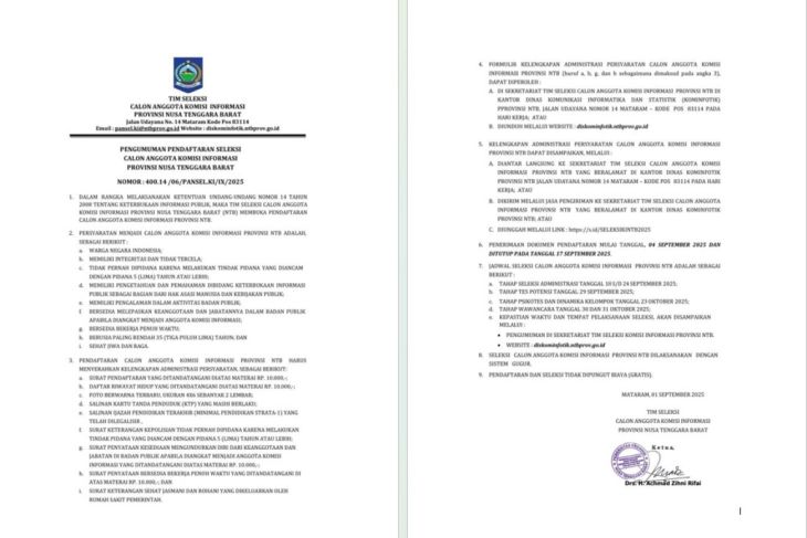 Jakarta (ANTARA) - Tim Seleksi Calon Anggota Komisi Informasi Provinsi Nusa Tenggara Barat (NTB) resmi membuka pendaftaran bagi masyarakat yang berminat menjadi anggota Komisi Informasi (KI) NTB periode mendatang. Pendaftaran dibuka mulai 4 September hingga 17 September 2025.