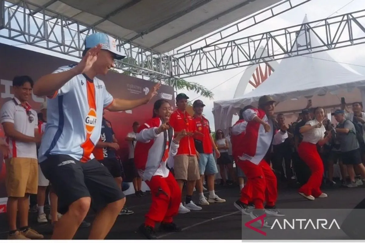 Para pembalap MotoGP ini ikut berjoget bersama dipandu sejumlah penari anak-anak disaksikan ribuan penggemar yang memadati panggung utama di Teras Udayana Kota Mataram.