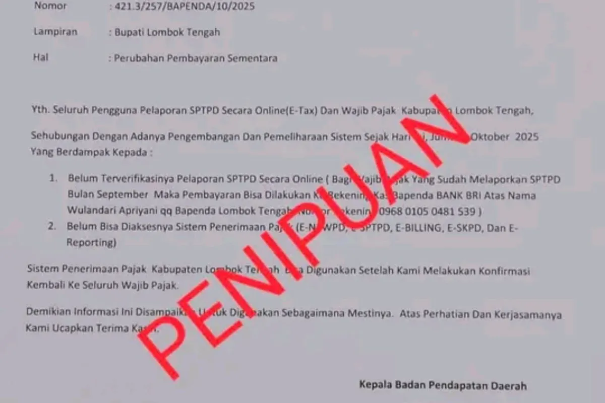"Bapenda tidak pernah meminta atau mengarahkan Wajib Pajak untuk melakukan transfer ke rekening pribadi. Seluruh pembayaran pajak daerah hanya dilakukan ke rekening resmi atas nama Bapenda Lombok Tengah," katanya.