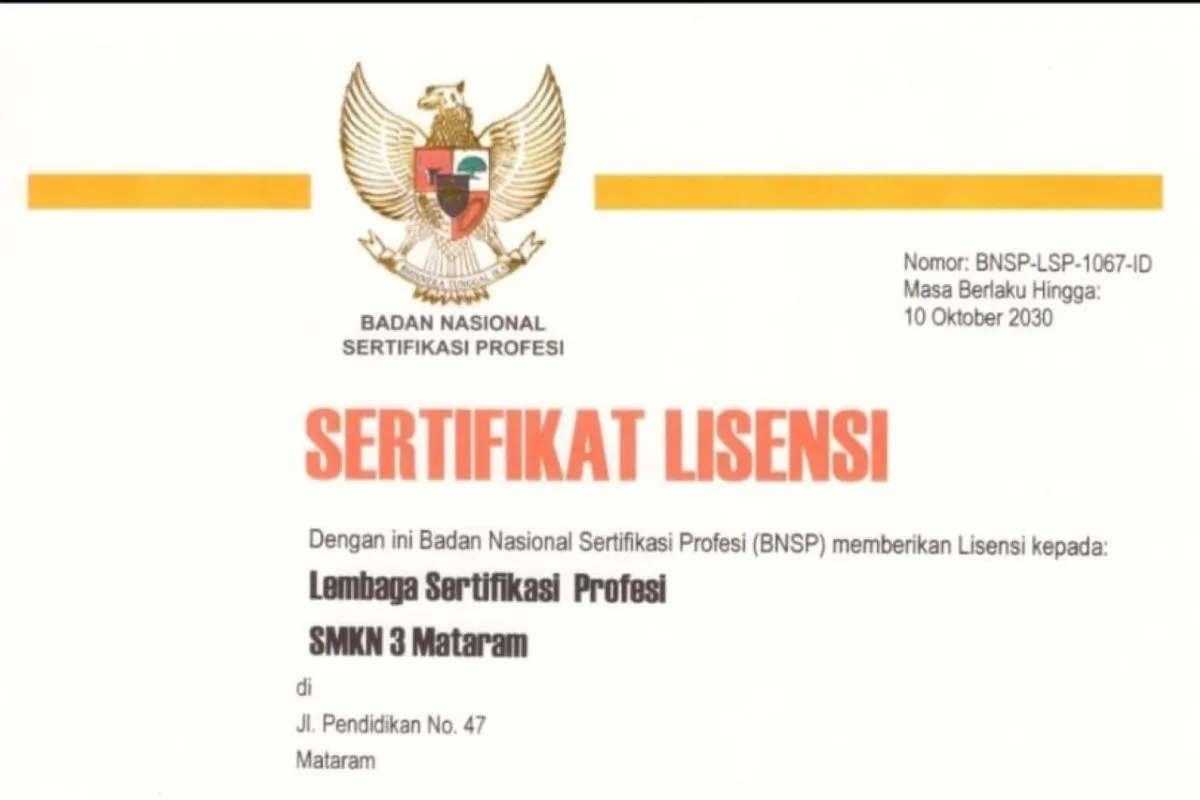 Mataram (ANTARA) - Lembaga Sertifikasi Profesi (LSP) P1 SMKN 3 Mataram resmi meraih relisensi dan penambahan ruang lingkup dari Badan Nasional Sertifikasi Profesi (BNSP) setelah melalui proses verifikasi dan uji kompetensi selama dua bulan.