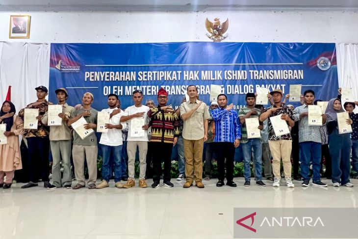 Muna, Sulawesi Tenggara (ANTARA) - Menteri Transmigrasi (Mentrans) Muhammad Iftitah Sulaiman Suryanagara menyerahkan 402 sertifikat hak milik (SHM) kepada transmigran di Muna sebagai bagian dari percepatan Program Trans Tuntas yang memastikan kepastian hukum atas lahan terlambat puluhan tahun.