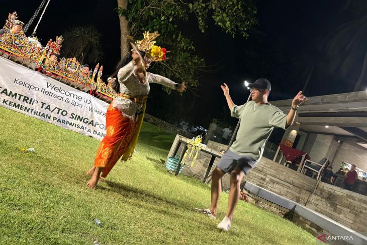 Empat perwakilan agen perjalanan dan operator tur asal Singapura yang mengikuti program Famtrip diajak menari dengan iringan musik tradisional saat mengunjungi Jembrana.