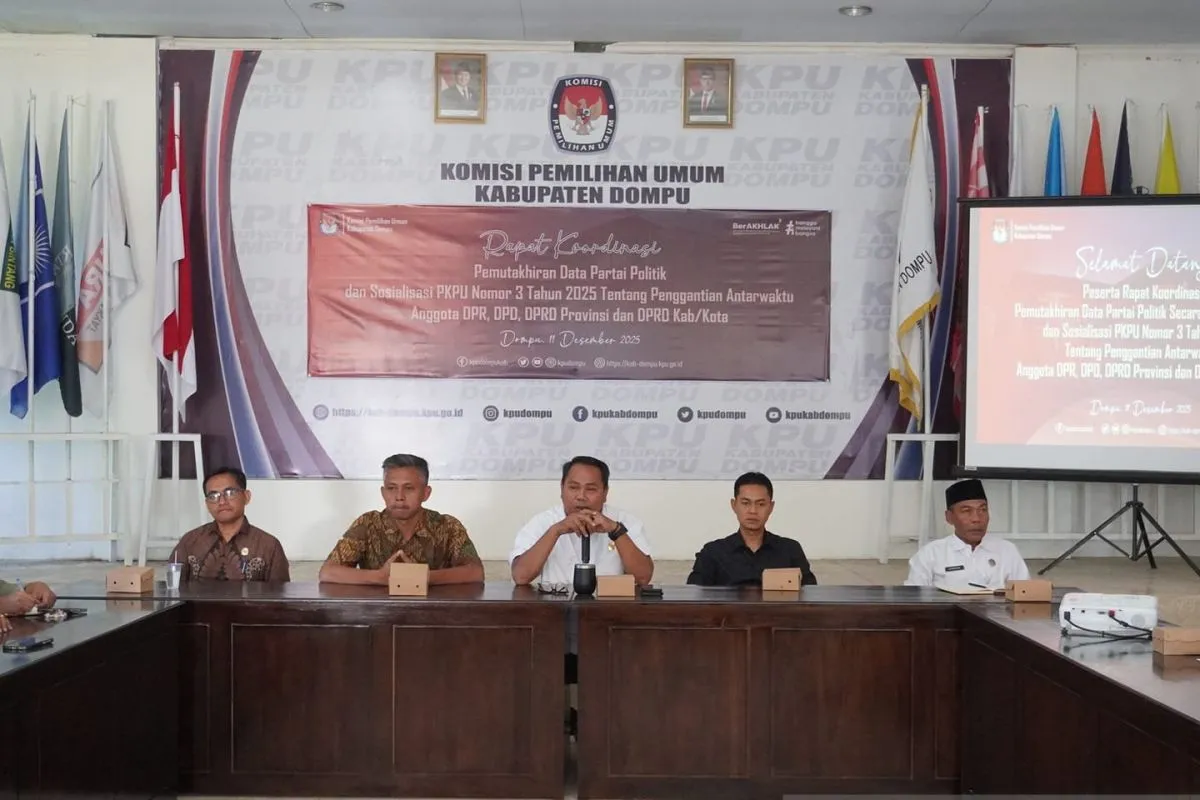"Rakor tersebut membahas tiga agenda utama, yakni penguatan akurasi dan keberlanjutan data partai politik melalui Sistem Informasi Partai Politik (SIPOL), penyamaan pemahaman mengenai mekanisme Penggantian Antar Waktu (PAW) sebagaimana diatur dalam PKPU Nomor 3 Tahun 2025, serta peningkatan koordinasi dan konsolidasi antara KPU, partai politik, dan Bawaslu dalam mengawal tahapan pemilu," kata Ketua KPU Kabupaten Dompu, Arif Rahman kepada ANTARA.