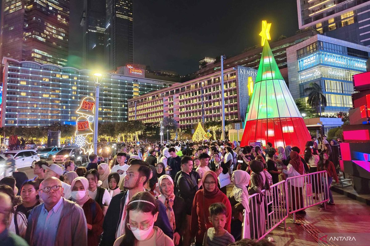 Mereka tampak antusias menyusuri area Bundaran HI yang dihiasi aneka ornamen lampu bertema Natal dan akhir tahun, mulai dari pohon Natal berukuran besar, terowongan lampu warna-warni, boneka salju, hingga instalasi cahaya yang menghiasi pepohonan di sepanjang jalan protokol.
