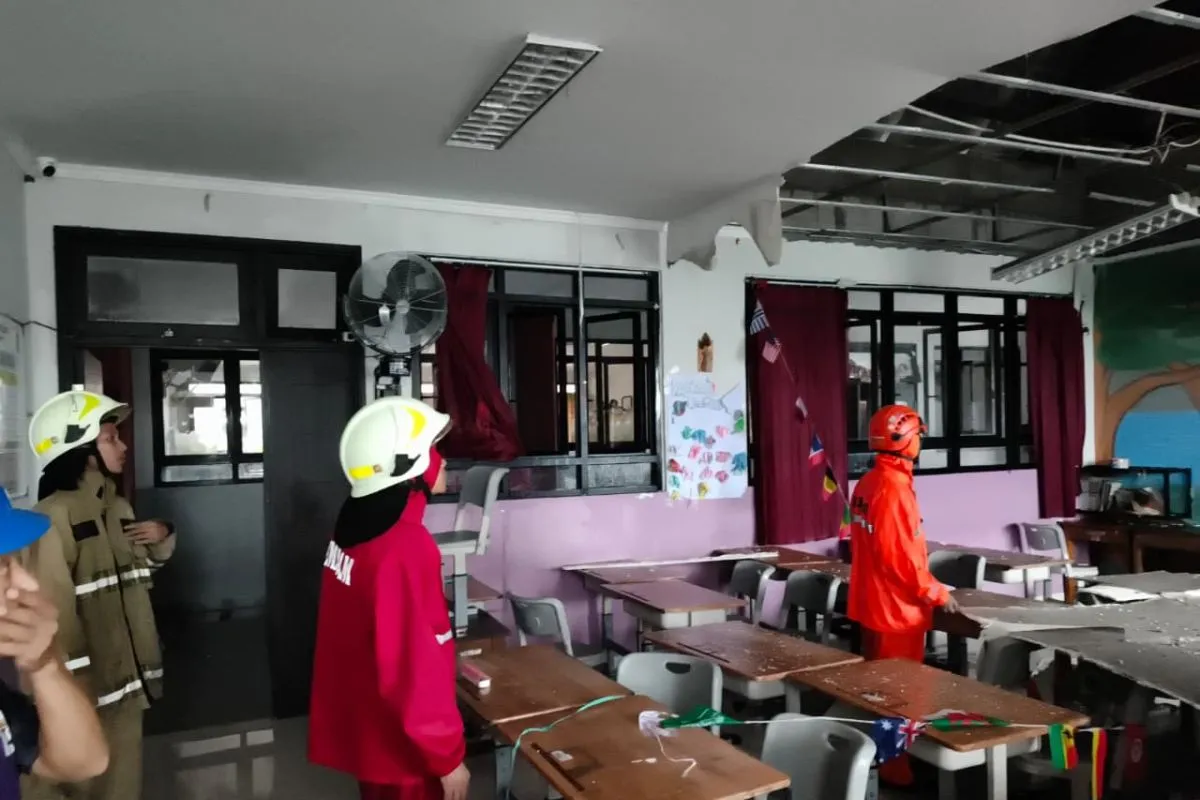 Petugas BPBD Jakarta melihat kondisi plafon sekolah SDN Pademangan Timur 05 yang ambrol saat hujan deras di Jakarta, Rabu (14/1/2026) (ANTARA/HO-BPBD Jakut)