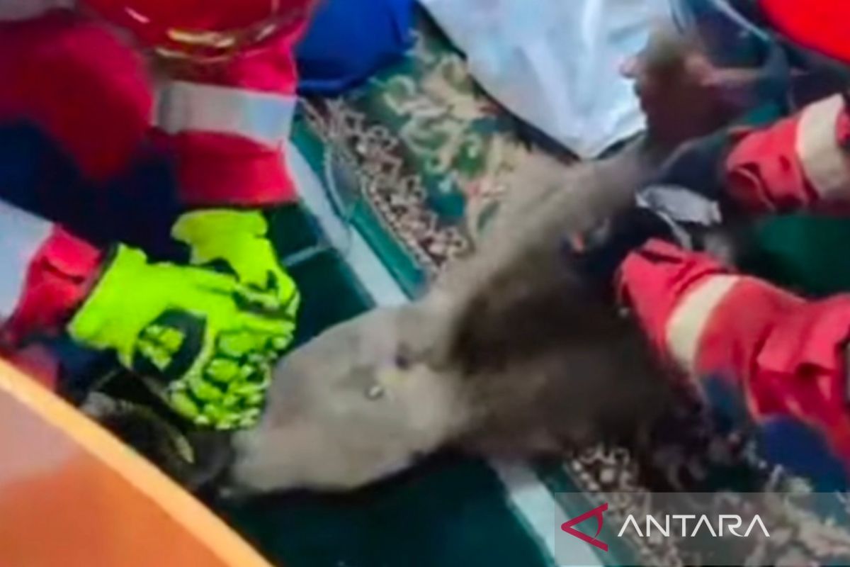 Jakarta (ANTARA) - Petugas Suku Dinas Penanggulangan Kebakaran dan Penyelamatan Sektor Cakung Jakarta Timur mengevakuasi seekor monyet liar yang masuk ke masjid di permukiman warga di Kampung Baru, Kelurahan Cakung, Barat, pada Sabtu sore.