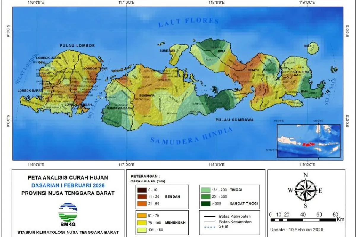 Cakra mengatakan secara umum curah hujan di seluruh wilayah NTB bervariasi dari kategori rendah 21-50 milimeter per dasarian hingga kategori sangat tinggi lebih dari 300 milimeter per dasarian pada 1-10 Februari 2026.