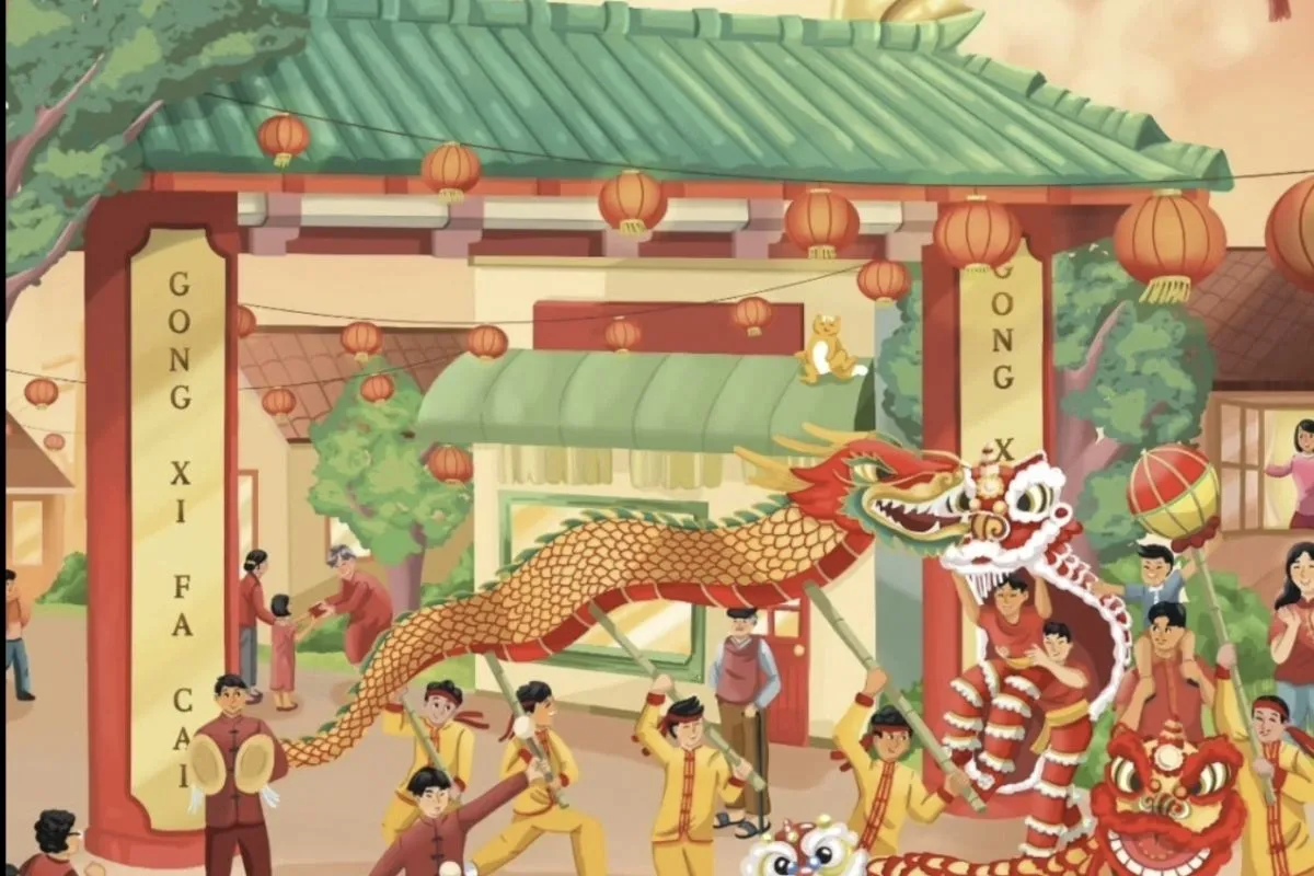 Foto yang diposting menampilkan suasana perayaan Tahun Baru Imlek berupa pertunjukan barongsai dan drakar yang penuh warna, diiringi musik dan drum yang meriah.