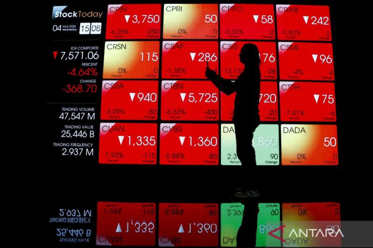 Data perdagangan sesi II pada Rabu (04/03) pukul 14.07 WIB, IHSG bergerak melemah 417,95 poin atau 5,26 persen ke posisi 7.521,81, sejalan dengan pelemahan bursa saham kawasan Asia.