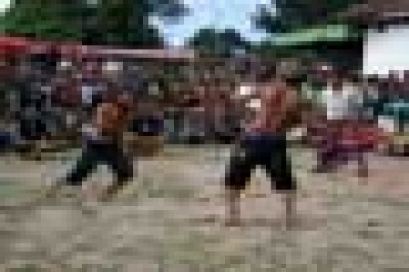 Dua orang "pepadu" (orang yang memainkan presean) bertarung dalam pertandingan presean yang diadakan di Desa Pemepek,Kecamatan Pringgarata,Praya,Lombok Tengah,NTB,Minggu (9/8). Presean adalah salah satu kesenian tradisional masyarakat sasak di Lombok dan pertandingan presean itu diadakan untuk memeriahkan perayaan Hari Kemerdekaan RI yang ke-64 pada 17 Agustus mendatang(Foto:Ahmad Subaidi/ ANTARAMataram.com/09)
