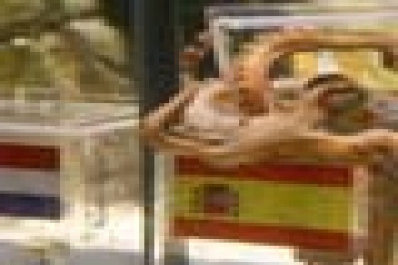 Gurita bernama Paul membuka kotak yang dihiasi dengan bendera Spanyol (9/7) di Aquarium Laut Hidup di Oberhausen, Jerman Barat. Paul meramalkan siapa yang akan menjadi juara pada Piala Dunia 2010 antara Belanda dan Spanyol pada 11 Juli 2010 di Johannesburg, Afrika Selatan. Paul yang sudah berhasil menebak pemenang dari enam pertandingan sebelumnya, meramal Spanyol menjuarai Piala Dunia untuk pertama kalinya.( AFP PHOTO / Patrik STOLLARZ )