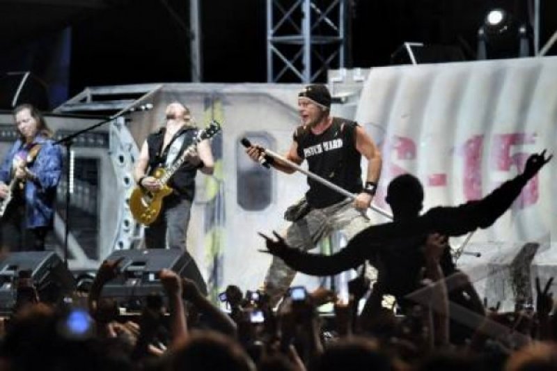 Personel grup musik Iron Maiden yang dimotori vokalis Bruce Dickinson (kanan) bersama dua gitaris, Adrian Smith (tengah) dan Dave Murray (kiri) beraksi di atas panggung saat konser bertajuk "The Final Frontier World Tour 2011" di Taman Budaya Garuda Wisnu Kencana (GWK), Bali, Minggu (20/2) malam. Grup musik heavy metal asal Inggris itu mengadakan "World Tour 2011" di 62 kota di dunia hingga bulan Agustus nanti dan di Indonesia Iron Maiden pentas di 2 tempat yaitu di Jakarta dan Bali.<b>FOTO ANTARA/Nyoman Budhiana/1nz/1.<b>
