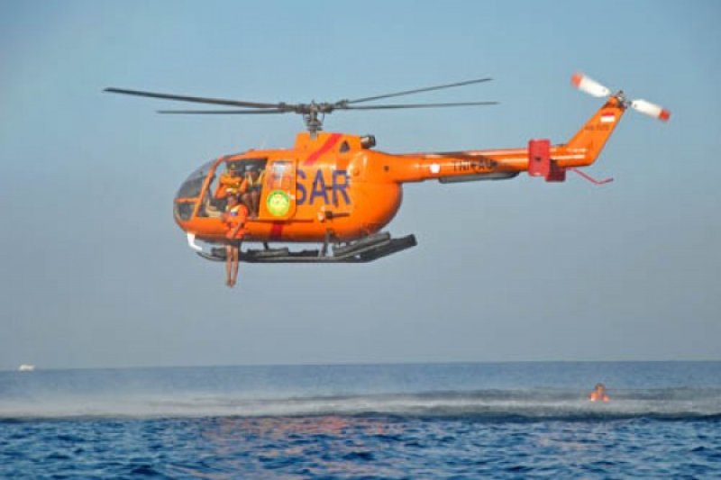 Seorang anggota SAR melakukan aksi "free Jump" atau terjun bebas dari helikopter saat mengikuti latihan dasar anggota Badan SAR Nasional (Basarnas) di pantai Senggigi, Kecamatan Batulayar, Gerung, Lombok Barat, NTB, Sabtu (9/7). Latihan dasar yang bertujuan guna membentuk sikap siaga fisik serta mental itu diikuti oleh 90 anggota Basarnas dari 6 kantor SAR Region III yaitu Ambon, Balikpapan,Kupang, Kendari, Makasar dan Mataram.FOTO Antaramataram.com/Ahmad Subaidi.