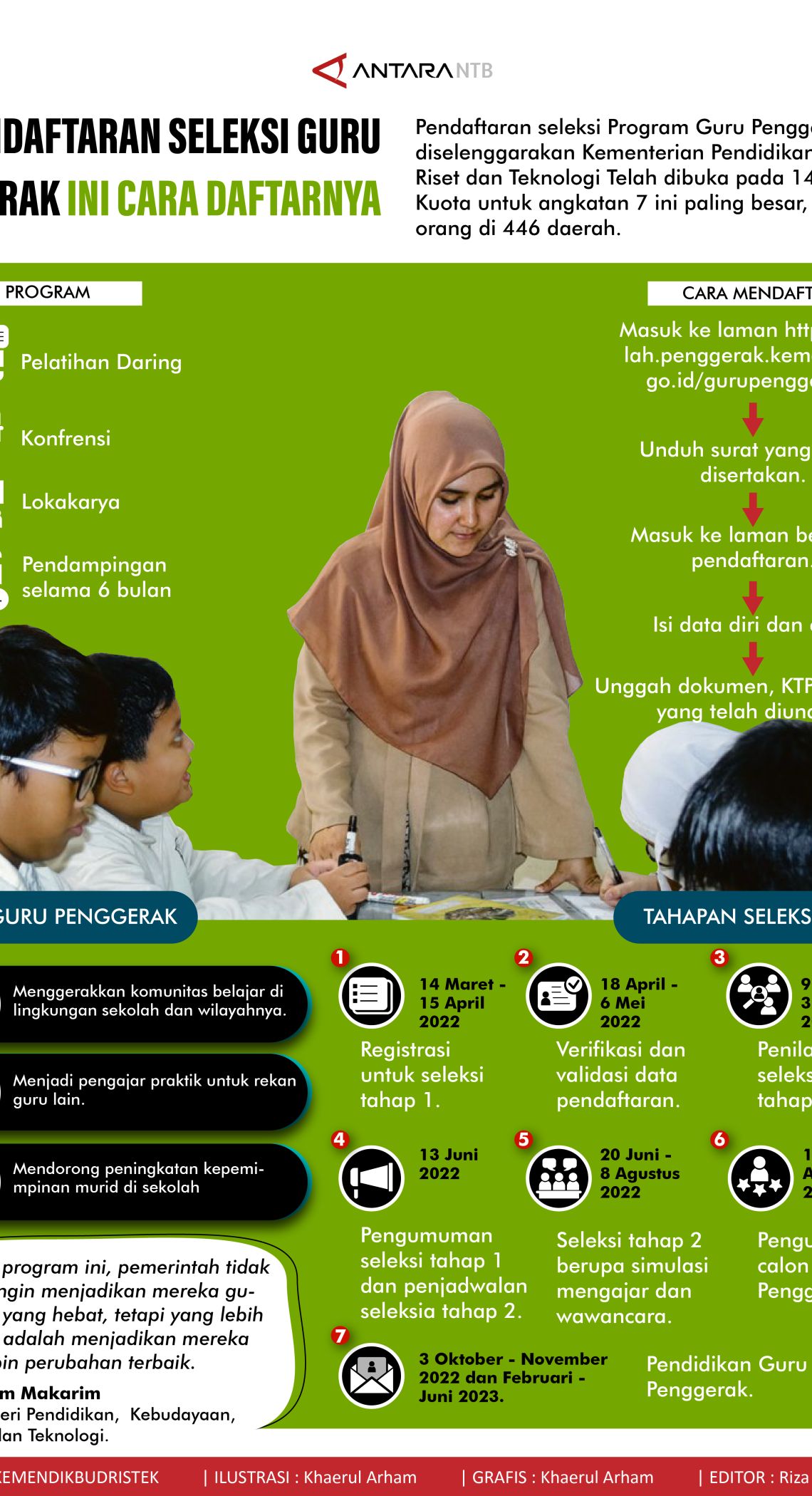 Pendaftaran seleksi Program Guru Penggerak yang diselenggarakan Kementerian Pendidikan, Kebudayaan Riset dan Teknologi Telah dibuka pada 14 Maret 2022. Kuota untuk angkatan 7 ini paling besar, yakni 20.000 orang di 446 daerah.