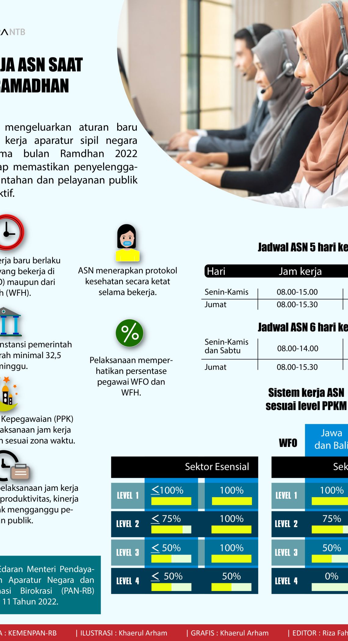 Jam kerja ASN saat Bulan Ramadhan 2022 Selasa, 29 Maret 2022 18:14 Pemerintah mengeluarkan aturan baru terkait jam kerja aparatur sipil negara (ASN) selama Ramadhan 2022 dengan tetap memastikan penyelenggaraan pemerintahan dan pelayanan publik berjalan efektif. COPYRIGHT © ANTARA Mataram 2025 facebook Twitter Whatsapp pinterest