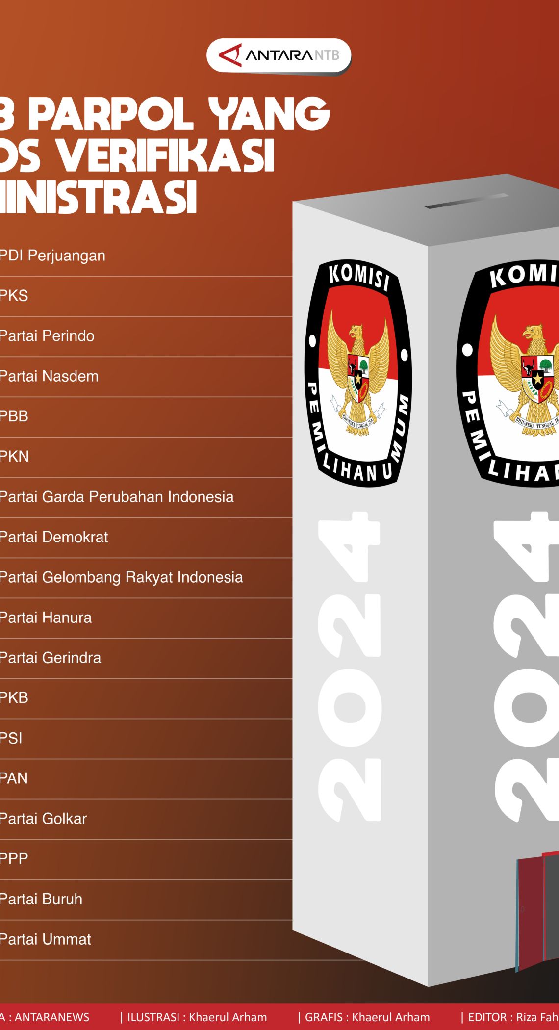 Komisi Pemilihan Umum RI menyatakan terdapat 18 partai politik calon peserta Pemilu 2024 yang dinyatakan lolos verifikasi administrasi.