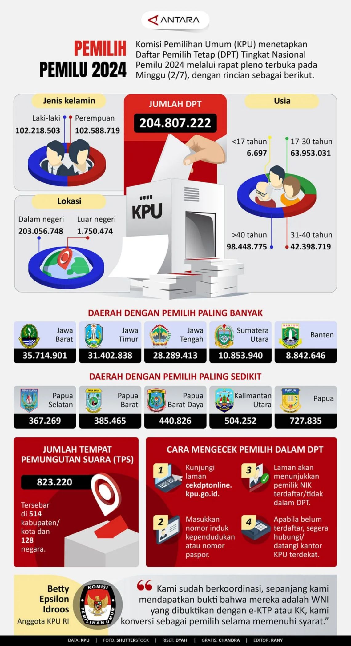 Pemilih Pemilu 2024 Selasa, 4 Juli 2023 21:44 Komisi Pemilihan Umum (KPU) menetapkan Daftar Pemilih Tetap (DPT) Tingkat Nasional Pemilu 2024 melalui rapat pleno terbuka pada Minggu (2/7), dengan rincian sebagai berikut. COPYRIGHT © ANTARA Mataram 2026 facebook Twitter Whatsapp pinterest