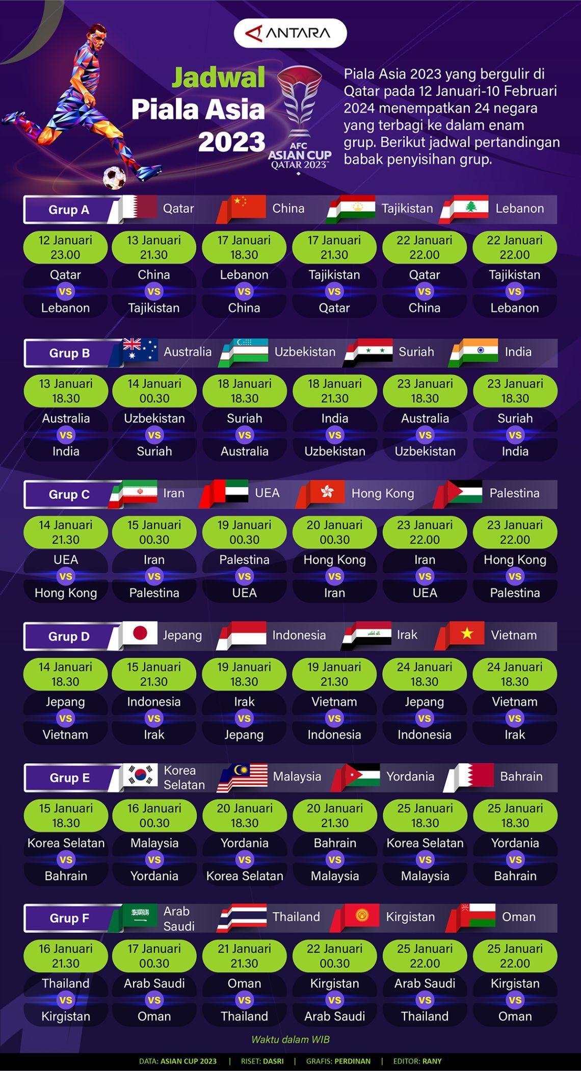 Jadwal Piala Asia 2023 Jumat, 5 Januari 2024 9:47 Piala Asia 2023 yang bergulir di Qatar pada 12 Januari-10 Februari 2024 menempatkan 24 negara yang terbagi ke dalam enam grup. Berikut jadwal Piala Asia 2023 pada babak penyisihan grup. COPYRIGHT © ANTARA Mataram 2026 facebook Twitter Whatsapp pinterest