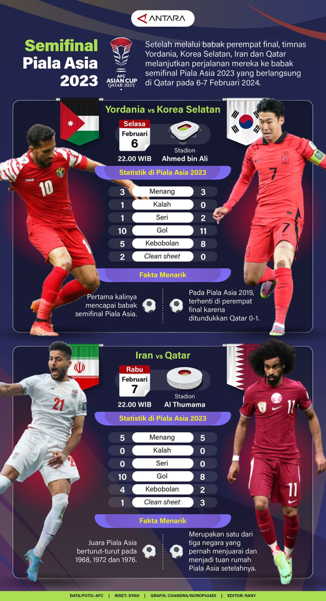 Setelah melalui babak perempat final, timnas Yordania, Korea Selatan, Iran dan Qatar melanjutkan perjalanan mereka ke babak semifinal Piala Asia 2023 yang berlangsung di Qatar pada 6-7 Februari 2024.