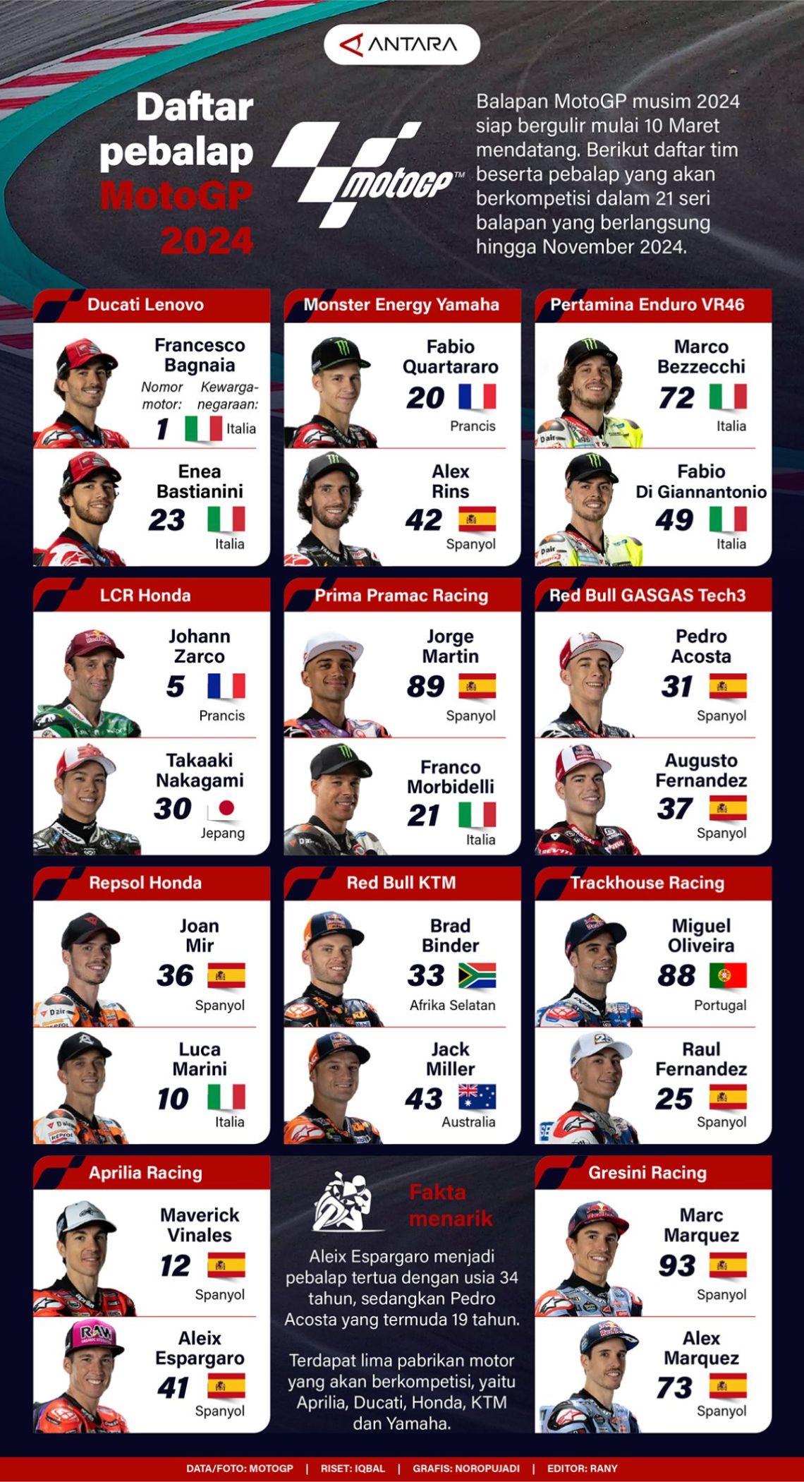 Daftar pebalap MotoGP 2024 Selasa, 27 Februari 2024 12:36 Balapan MotoGP musim 2024 siap bergulir mulai 10 Maret mendatang. Berikut daftar tim beserta pebalap yang akan berkompetisi dalam 21 seri balapan yang berlangsung hingga November 2024. COPYRIGHT © ANTARA Mataram 2026 facebook Twitter Whatsapp pinterest