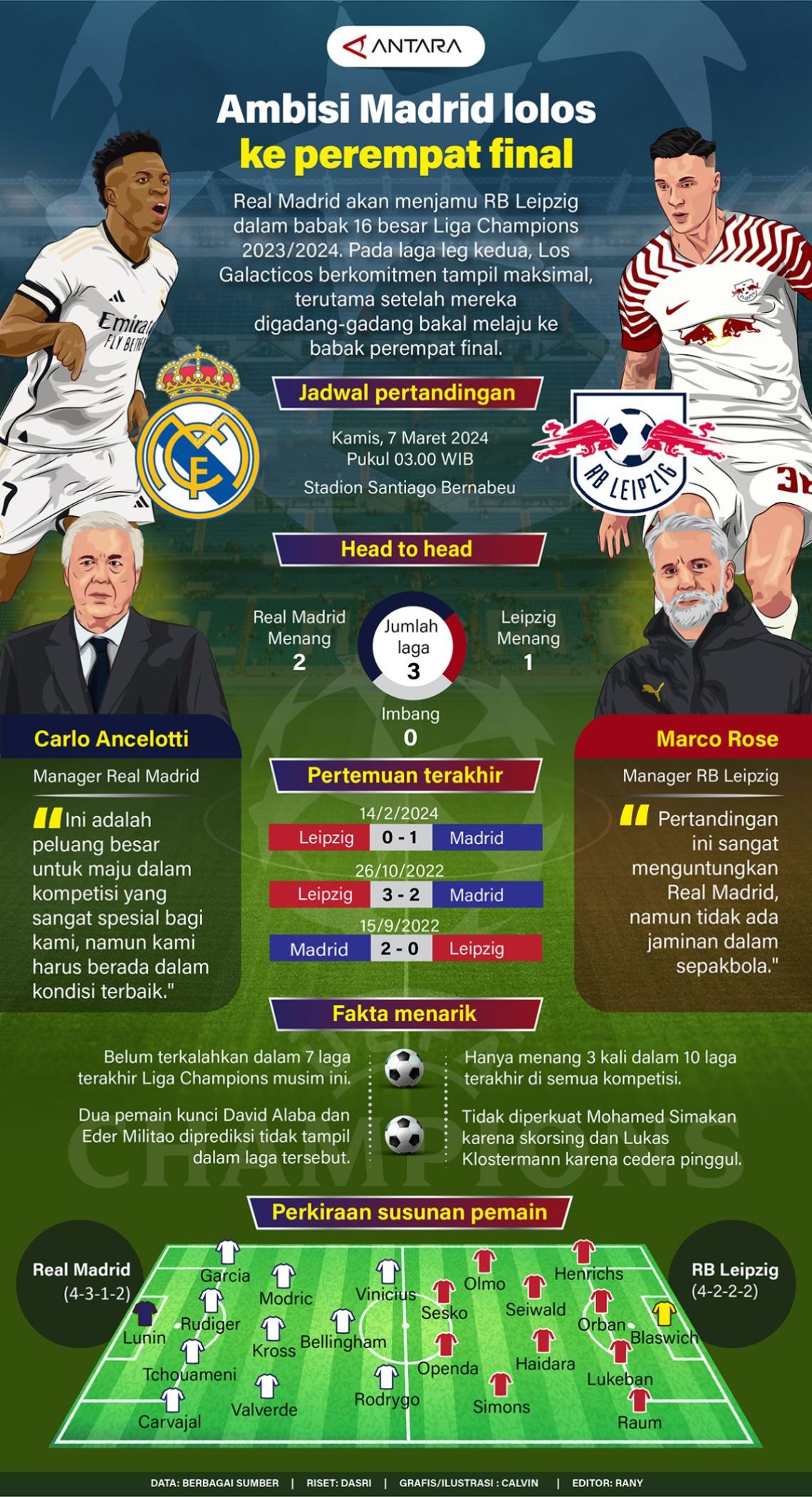 Real Madrid akan menjamu RB Leipzig dalam babak 16 besar Liga Champions 2023/2024. Pada laga leg kedua, Los Galacticos berkomitmen tampil maksimal, terutama setelah mereka digadang-gadang bakal melaju ke babak perempat final.