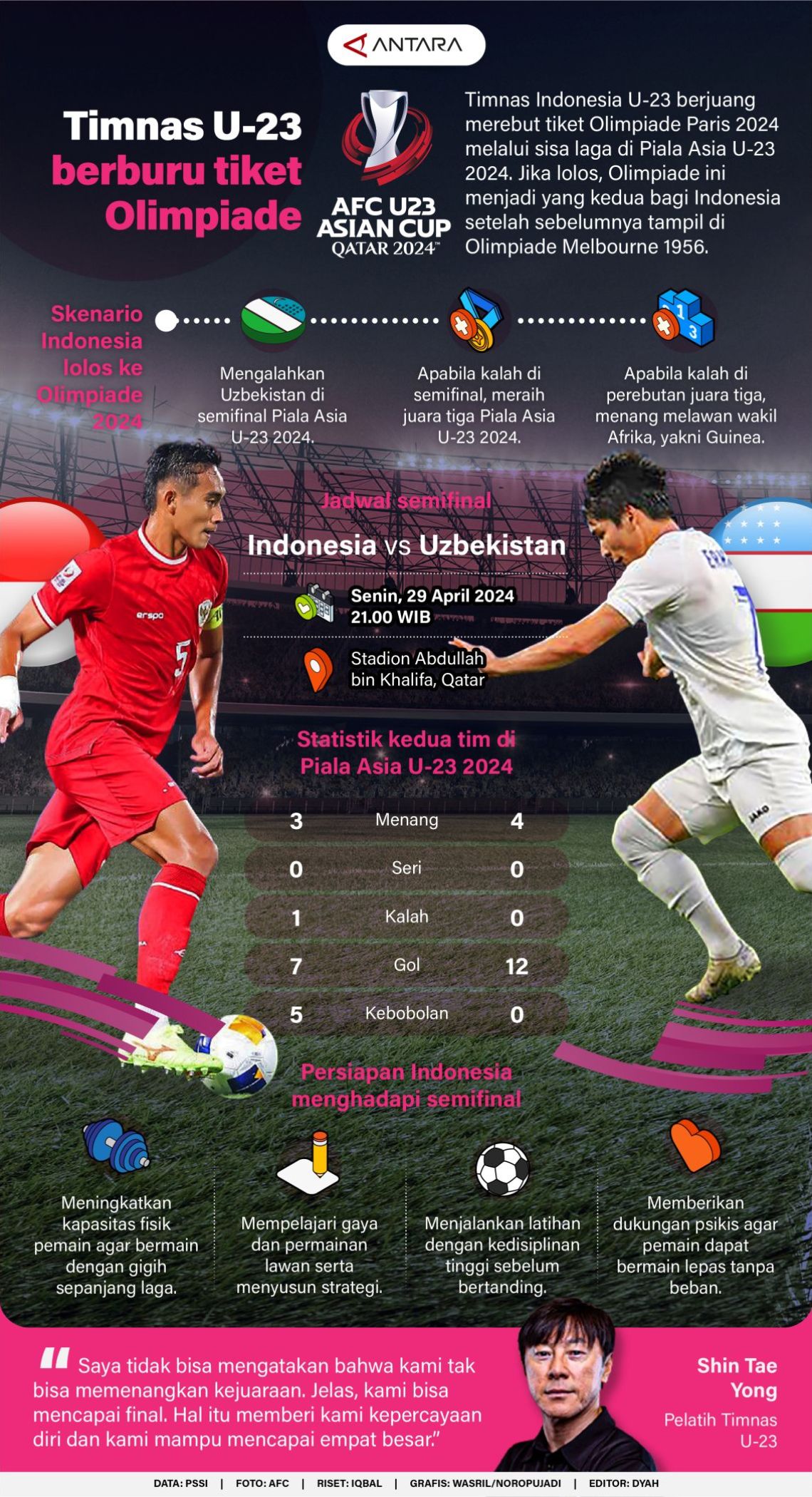 Timnas Indonesia U-23 berjuang merebut tiket Olimpiade Paris 2024 melalui sisa laga di Piala Asia U-23 2024. Jika lolos, Olimpiade ini menjadi yang kedua bagi Indonesia setelah sebelumnya tampil di Olimpiade Melbourne 1956.