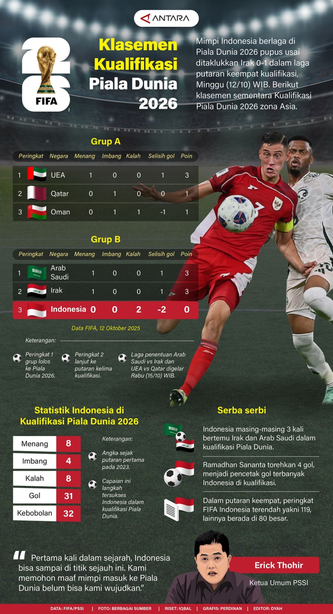 Mimpi Indonesia berlaga di Piala Dunia 2026 pupus usai ditaklukkan Irak 0-1 dalam laga putaran keempat kualifikasi, Minggu (12/10) WIB. Berikut klasemen sementara Kualifikasi Piala Dunia 2026 zona Asia.