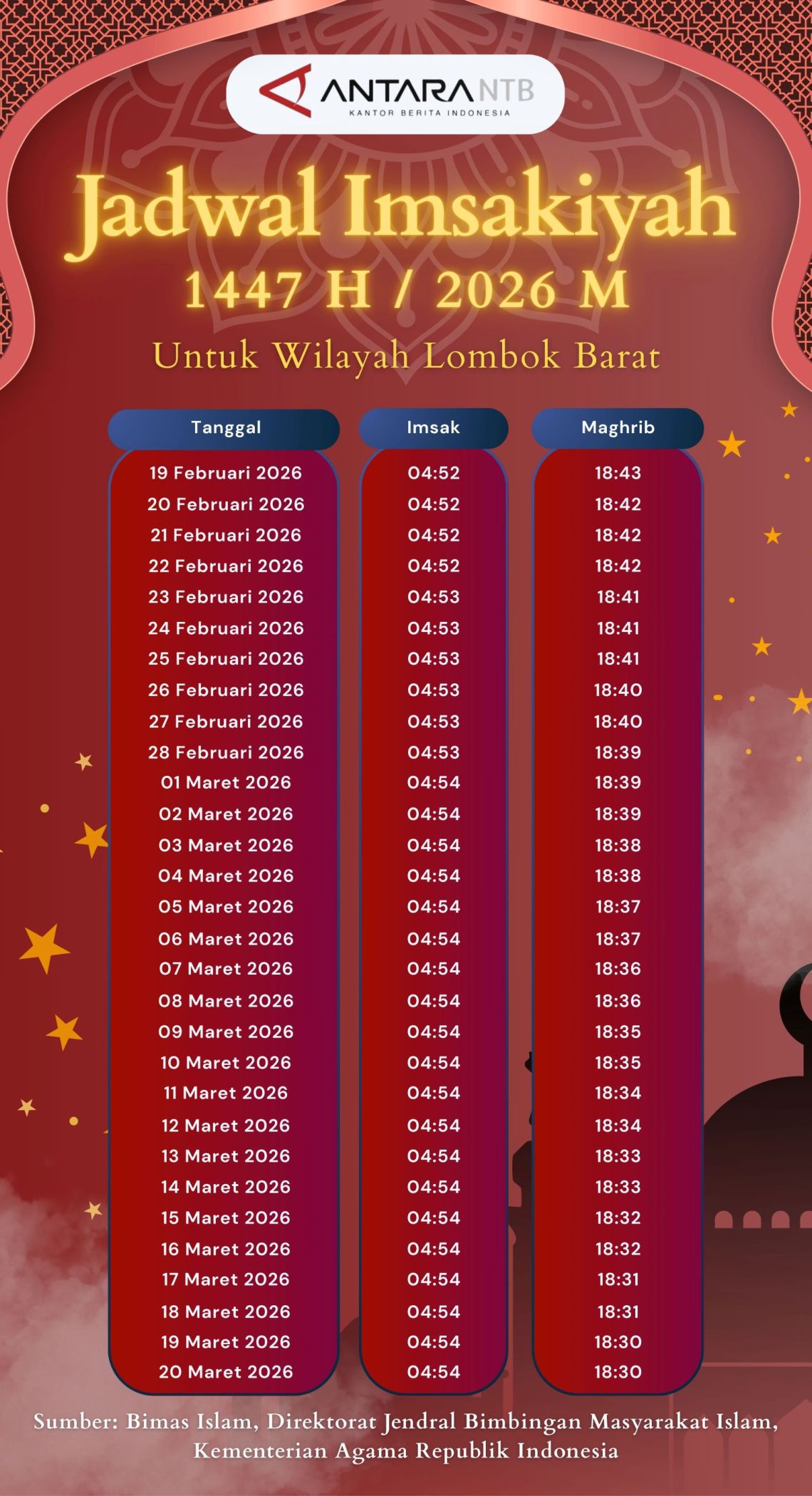 Jadwal Sahur dan Buka Puasa Ramadhan 1447 H / 2026 M di wilayah Lombok Barat dan sekitarnya